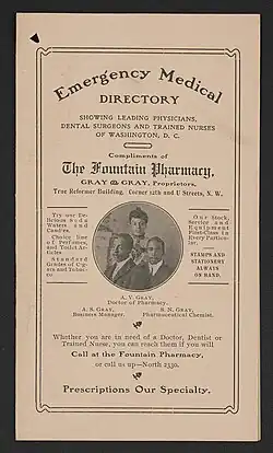 Gray initially worked as a pharmacist for the Woman's Clinic in Washington, before partnering with Arthur and opening the Fountain Pharmacy in 1905.[6] The Grays' pharmacy, at 12th and U Streets NW, sat in the heart of the black commercial district,[5] and the couple became an active part of Washington's African American elite.[6] Fountain Pharmacy was described as: