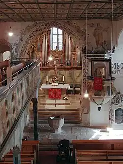 The Renaissance painting by Jörg Herzog in the chancel above the entrance to the vestry shows the creation of man in paradise and the story of Cain and Abel. To the left of the eastern chancel window, Moses with the ten commandments is depicted, while his brother Aaron is portrayed to the right of the window. The painting of the Creation on the chancel side of the triumphal arch could not be restored.