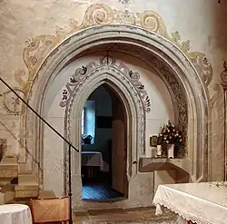 In the 18th century, the church was embellished in the Rococo style. The Gothic ceiling, door and window embrasures and the rector's stall were painted with ornamental imagery (German: Bandelwerk). The same artist, Hans Stiegler, painted the oils on the gallery balustrades. In 1766 the church received the organ, whose casing is preserved to this day.
