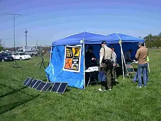 Solar-powered Amateur Radio Station in tents. Note the portable VHF/UHF satellite and HF antennas in the background