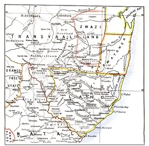 British suzerainty or overlordship was asserted by a treaty made with Queen Regent Zambilli of Amatongaland in 1887.[3] The population at the time was estimated at 38,000, mainly Amatonga (alternative name Maputa).[4] In 1889, the British set-up a commission which defined the boundary between Amatongaland and Zululand, the latter territory having been annexed as a British protectorate in 1887.