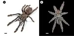 - ^ a b Hüsser, Martin (2018-12-09). "A first phylogenetic analysis reveals a new arboreal tarantula genus from South America with description of a new species and two new species of Tapinauchenius Ausserer, 1871 (Araneae, Mygalomorphae, Theraphosidae)". ZooKeys (784): 59–93. Bibcode:2018ZooK..784...59H. doi:10.3897/zookeys.784.26521. ISSN 1313-2970. PMC 6160856. PMID 30279631.