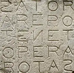 The first Sator square palindrome was found in the ruins of Pompeii, meaning it was created before the Eruption of Mount Vesuvius in 79 AD. A sator square using the mirror writing for the representation of the letters S and N was carved in a stone wall in Oppède (France) between the Roman Empire and the Middle Ages,[26] thus producing a work made up of 25 letters and 8 different characters, 3 naturally symmetrical (A, T, O), 3 others decipherable from left to right (R, P, E), and 2 others from right to left (S, N). This engraving is therefore readable in four directions.[27]
