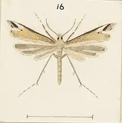 ♀. 25 mm. Head white. Palpi 2+12, greyish-ochreous sprinkled with dark fuscous, white above. Antennas grey. Thorax whitish suffusedly sprinkled with brownish-ochreous, patagia becoming clear white posteriorly. Abdomen white, partially suffused with pale brownish-ochreous except towards base. Legs white, anterior femora and tibiae fuscous. Fore-wings with apex pointed, subfalcate, termen rather deeply concave; pale brownish-ochreous densely irrorated with white, broadly suffused with white towards costa and dorsum on posterior half; basal 14 of costa irrorated with dark fuscous, thence a narrow dark fuscous costal streak reaching to 34; a dot of two or three dark fuscous scales in disc at 25; a short transverse blackish-fuscous mark before cleft; a strong oblique blackish streak from apex to anterior half of lower margin of first segment, where it is broadest; an undefined blackish-fuscous longitudinal dash in centre of basal half of second segment : cilia whitish, with a dark fuscous spot above apex, an interrupted blackish basal line on central third of termen, and two or three blackish scales on dorsum at 23. Hindwings pale fuscous, second segment whitish-tinged; cilia whitish-fuscous; two or three fine blackish hair scales in dorsal cilia of third segment beyond middle.[3]
