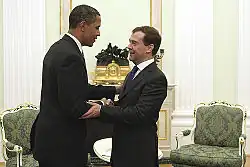 Former President Obama met with then-President Dmitry Medvedev on July 7, 2009, during the 50th Anniversary of the American National Exhibition.