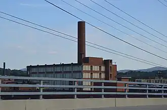 An option was placed on the American Viscose site in 1959 by Union Carbide, but that company ultimately backed out.[3] In 1961, American Viscose auctioned off its remaining equipment and a consortium of Roanoke investors purchased the property.[3] The site was subdivided and turned into the Roanoke Industrial Center, the city's second industrial park, and as of June 2023 the complex had 120 tenants.[13] Sixteen of the original buildings still stand, many with little alteration.[3] As a precautionary measure against eventual decay, the factory's original smokestacks, once standing 300 feet (91 m) tall, were pared down in 2001.[14] Bricks were removed from the top and gradually dropped inside the hollow chimneys until the level of debris inside reached the level of the walls.[14]