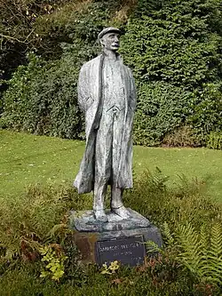 He is commemorated by a bronze statue in Uppermill by Manchester sculptor James Collins, commissioned as part of the 1991 Saddleworth Festival for the Arts .[7] The bronze was cast by "Benin Bronze" art foundry in Wigan, 1989-90. The foundry no longer operates. There are also commemorative plaques on the rocks of Millstone Edge, Standedge, where his ashes were scattered. The Pennine Way National Trail passes this spot, which is near a trig point at an elevation of 1470 ft (448m).[8] Alfred Wainwright in his 1968 Pennine Way Companion describes Ammon Wrigley as a "much-revered writer and poet whose love of the country around his native Saddleworth shone in all his works" and mentions an annual commemorative ceremony at the memorial stone; he includes a sketch of "The Ammon Wrigley Memorial Stone" showing the plaques.[9]