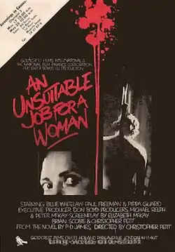 An Unsuitable Job for a Woman is a 1982 British psychological thriller film directed by Chris Petit and starring Billie Whitelaw, Paul Freeman, and Pippa Guard. It follows a young female private investigator who is hired to investigate the mysterious suicide of a university student, only to uncover a number of disturbing secrets about his family. The film is based on the 1972 novel of the same name by P. D. James. It marked the first adaptation of the novel, followed by a television series adaptation produced in 1997.