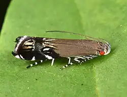 The forewings are dark brownish, with a cupreous line. The apical half of the wing is darker than the basal half. About the middle of the costa is a short, oblique white streak and another of the same hue midway between it and the tip of the wing, perpendicular to the costa and of nearly triangular form. Beneath the first costal streak are two short, longitudinal dashes, one on each side of the fold of the wing, and two others of the same hue, parallel, and beneath the second costal streak. The hindwings are dark brownish.[3]