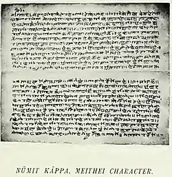 Ancient Meitei literature, also termed as Old Manipuri literature, is literature written in the Old Manipuri language from the earliest texts until the time of King Pamheiba (Meitei for 'Garib Niwaj'). All the ancient Meitei literary works are written in the traditional Meitei script.[1] The ancient Meitei language texts, written in Meitei script, are conventionally termed as "the puyas".[2]