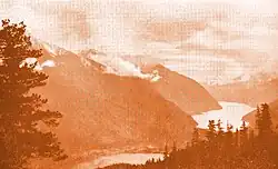 The region comprises a mix of volcanic and sedimentary rocks.[6] At the end of the Last Glacial Period (LGP), Seton and Anderson were a single continuous lake, with a level about 100 metres (330 ft) higher than present. At the Seton Portage area, erosion and landslides of weak rocks susceptible to rapid weathering tumbled into the lake, and tributaries deposited sediment. Over tens of thousands of years, the accumulation created separate lakes, and a river formed from Anderson to Seton,[9] which by 1910 was about 18 metres (60 ft) lower[10] (currently 15 metres (50 ft)).[11] Minimal agricultural land exists along the mountainous shores of the lake beyond a limited area at the portage.[12] Here, a noticeable gap in the mountains indicates a large landslide on the east side.[7]
