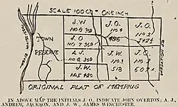 Jackson was partners with John Overton in developing what was called the Fourth Chickasaw Bluff and laying out a town called Memphis, Tennessee.[1] He sold most of his stake to James Winchester and John Christmas McLemore, and sold his remaining 1/8th interest in 1823, in anticipation of his first presidential run.[1]