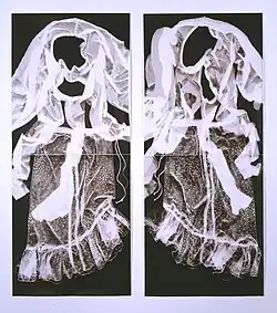 Douthat makes large photograms. She places found objects, chosen for their transparent or opaque qualities, atop photosensitive paper and lets the light burn through to create silhouette-like imagery. Later, the paper is chemically gold-toned—it gets a purplish color—and fixed for permanence. Her Alterations series is of life size images of women's apparel, including wedding dresses.[2][3]