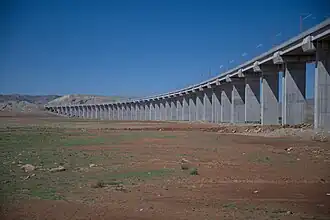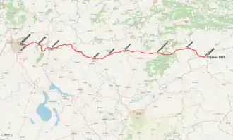 The Ankara–Sivas high-speed railway (Turkish: Ankara–Sivas yüksek hızlı demiryolu), is a 406 km (252 mi) long high-speed railway in Turkey and is the second longest high-speed railway in the country after the Ankara–Istanbul high-speed railway. Travel time between Ankara and Sivas was reduced to 2 hours and 50 minutes,[2] from around 9 hours and 30 minutes with conventional trains.[3][4] The railway will also serve as an extension of the Ankara-Istanbul HSR with a total journey time from Istanbul to Sivas at around 7 hours. The line was opened on April 26, 2023.[5]