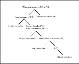This original stem—the Lorsch Annals of 785—from which all three annalistic traditions diverge after 785 was probably composed at the Abbey of Lorsch.[3] Textually it is related to the Annales nazariani, Annales guelferbytani, and Annales alamannici, all depending on the earlier, hypothetical "Murbach Annals", composed at Murbach Abbey (founded 727) and covering the years up to 751. Since the Lorsch annals of 785 were based on an erroneous copy of these Murbach annals, events in the 750s are consistently mis-dated.[7] The frequency of references to the abbey of Lorsch between the years 764 and 785 suggests that the work of compilation done in 785 was performed there. The Abbey of Gorze is also mentioned, but less frequently, and the death of only one of its abbots is mentioned, whereas all the Lorsch abbots of the period receive obituaries.[f] These Lorsch annals may have been circulated in batches of years, before they were completed.[2] The nature of the Sankt-Paul codex supports the contention that unfinished batches of annals were circulated in libelli (booklets) comprising single quires.
