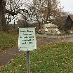 The Annie C. Stewart Memorial Fountain is a fountain in Madison, the capital of the U.S. state of Wisconsin. Dedicated to the memory of Annie (Anna) C. Stewart (17 January 1867 – 8 April 1905), who engaged in charitable activities in Madison, it was constructed in 1917–1925 and erected in Henry Vilas Park in 1925. The fountain is located south of 625 Wingra Street, near the corner of Wingra Street and Erin Street (the former pedestrian entrance of Henry Vilas Zoo) in Vilas Park. The fountain is adjacent to an eagle effigy mound built by Native Americans overlooking Lake Wingra.