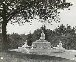 Mary C. Stewart died on 21 November 1905, a few months after Annie. Mary bequeathed a gift of US$2,000 (equivalent to US$69,993 in 2024) to the Madison Park & Pleasure Drive Association to commission a drinking fountain in memory of her only child, Annie.[5] The gift was to be used to construct a drinking fountain and in the will it stipulated that Annie's name was to be visibly inscribed on the fountain and that it be erected at an appropriate place in Madison in memory of her daughter.[6] In 1911, while working with the Madison Park & Pleasure Drive Association, John Nolen advised the board of directors to place the fountain in front of a proposed structure on the highest point of a parcel of land recently purchased with a gift from Mrs. Henry Vilas. The location for the fountain suggested by John Nolen offered a commanding view to the south and west and was intended to be the center of interest in Henry Vilas Park.[7] Mr. Nolen felt that this location was appropriate due to the Stewart and Vilas families being close acquaintances. Like the Stewart family, the Vilas family had also lost their son, Henry (28 May 1872 – 2 July 1899).