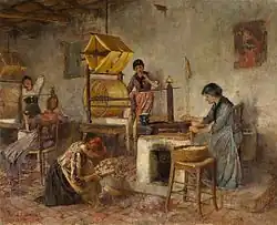 Frauen in der Webstube (trans: Women in the Weaving Room), signed by "Renouf-Whelpley, Munich, 1893"