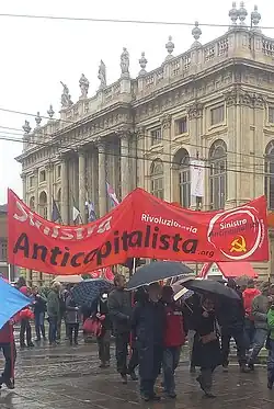 Following the dissolution of Critical Left (SC) in 2013, Franco Turigliatto, Antonio Moscato, and other militants of the former SC, founded a new party, Anticapitalist Left.[2][3] The new organization "promotes the elaboration and implementation of a revolutionary communist, feminist, environmentalist, and libertarian political program".[4] In anticipation of the Italian election of 2018 and after having started a dialogue with the Workers' Communist Party, SA decided to join Power to the People.[5][6] On 4 October, the Anticapitalist Left decided to abandon the project, deciding that working with former OPG and Eurostop members to give life to a new party would have distorted the original project of a common, open, pluralist and inclusive front. At its second national congress, held in February 2019, the Anticapitalist Left became the Italian section of the Fourth International.[7]