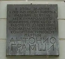 The failure of the workers' councils to develop into a national movement convinced Gramsci that a Communist party in the Leninist sense was needed. The group around L'Ordine Nuovo declaimed incessantly against the PSI's centrist leadership and ultimately allied with Bordiga's far larger abstentionist faction. On 21 January 1921, in the town of Livorno (Leghorn), the Communist Party of Italy (Partito Comunista d'Italia, PCd'I) was founded. In opposition to Bordiga, Gramsci supported the Arditi del Popolo, a militant anti-fascist group which struggled against the Blackshirts. Gramsci would be a leader of the party from its inception but was subordinate to Bordiga, whose emphasis on discipline, centralism and purity of principles dominated the party's programme until the latter lost the leadership in 1924.[34] In 1922, Gramsci travelled to Russia as a representative of the new party. Here, he met Julia Schucht (Yulia Apollonovna Schucht, 1896–1980), a young Jewish[35] violinist whom he married in 1923 and with whom he had two sons, Delio (1924–1982) and Giuliano (1926–2007).[36] Gramsci never saw his second son.[37]