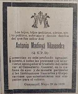 He died in Guayaquil on 26 May 1920; a family announcement thanked the public for condolences.[11]