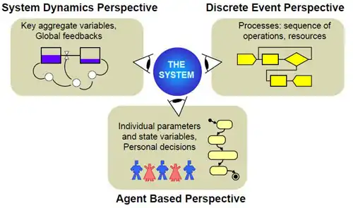 AnyLogic models can be based on any of the main simulation modeling paradigms: discrete event or process-centric (DE),[74] systems dynamics (SD),[75] and agent-based (AB).[7]