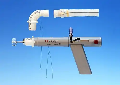 In 2011, Correx (Waltham, MA)[16] released a complete kit for AVB with an installation tool that enables coring and insertion of a left ventricle connector on a beating heart while maintaining hemostasis. Cardiopulmonary bypass (CPB) is not required. The kit is CE Marked and available in Europe. Several cases have been done in Canada under the Special Access Programme.[17] This kit is not currently available for use or sale in the United States.