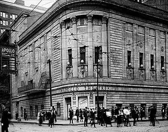 The Apollo Theatre was constructed in 1921 by theatrical producer A. H. Woods, who also owned the nearby Woods Theatre. It was located on Randolph Street, which was once known as Chicago's Great White Way and continues to be the center of Chicago's theater district. Designed by the architectural firm of Holabird and Roche, the theater was notable for its incorporation of elements of the Greek Revival style.