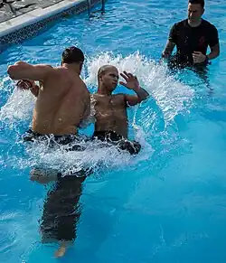 US Navy servicemen practise underwater search and rescue scenarios involving combative or panicky victims, which corresponds to certain aquathlonic disciplines