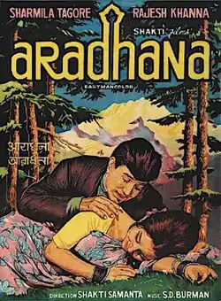 Aradhana (transl.Worship) is a 1969 Indian Hindi musical romantic drama film directed by Shakti Samanta, starring Sharmila Tagore and Rajesh Khanna. It won the Filmfare Award for Best Film at the 17th Filmfare Awards. Tagore gave one of the best performances of her career and won Filmfare Best Actress Award.[1] Originally released in Hindi[2] and dubbed in Bengali, Aradhana's huge success led to two remakes: the Tamil film Sivagamiyin Selvan (1974)[3] and the Telugu film Kannavari Kalalu (1974).[4] This film is counted among the 17 consecutive hit films of Rajesh Khanna between 1969 and 1971, by adding the two hero films Marayada and Andaz to the 15 consecutive solo hits he gave from 1969 to 1971.[5] Aradhana was a blockbuster in India and the Soviet Union.[6] The theme of the movie was based on the 1946 film To Each His Own.[7] Its run time is 169 minutes.