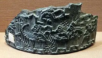 Among the Sumerian pictographs from around 3000 B.C. is one in Uruk that resembles a vertical bowed harp.[38] In this period similar representations also occur on stone tablets and seal impressions.[39] A horizontal bowed harp can also be recognized on a Bismaya steatite vase fragment from the second half of the 3rd millennium B.C.[26]