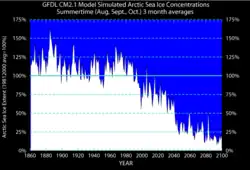 Summertime Arctic-wide sea ice extent simulated by the GFDL CM2.1 model for the historical period 1860 to 2000 and projected for the 21st century following the SRES A1B emissions scenario. Sea ice extent values are normalized (scaled) so that the average for years 1981 to 2000 is equal to 100%. Totally ice free summer conditions would equal 0%.
