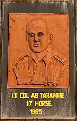 Tarapore was posthumously awarded the Param Vir Chakra, for leading the regiment while injured, and inflicting significant tank losses on the Pakistani side,[15] with an effective date of award of 11 September 1965.[2] The official citation reads: