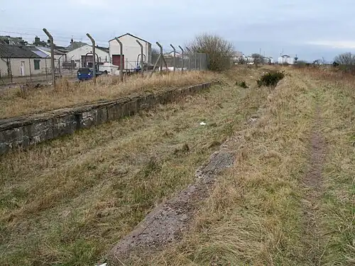 Joining the Caledonian Railway, the L&AR was absorbed into the London, Midland and Scottish Railway during the Grouping of 1923. The station was renamed Ardrossan North on 2 June 1924.[1] Other alternative names for the station were Ardrossan Montgomerie Street and Ardrossan Caledonian. The station closed to regular passenger services on 4 July 1932,[1] however it was used for special passenger services until 1939.[2][3] The line was taken into the Scottish Region of British Railways on nationalisation in 1948, seeing use for trains going to Montgomerie Pier and the nearby Shell Mex plant until 1968. All of the track north of the station was removed in 1970, however the spur line from the former Ardrossan Railway to the south remained intact serving the nearby bitumen plant until the 1980s.[4]