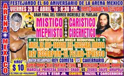 The show featured the finals of a three-week-long annual Torneo Nacional de Parejas Increibles tournament which saw the team of Místico and Mephisto defeat Carístico and Cibernético to win the entire 16-team tournament. On the undercard Rey Cometa defeated Cavernario, the reigning Mexican National Welterweight Champion in a non-title match.