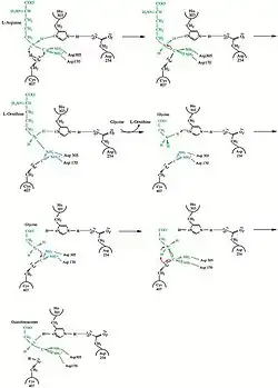 The formation of guanidinoacetate is normally the rate-limiting step of creatine biosynthesis.[3] Consequently, the AGAT reaction is the most likely control step in the pathway, a hypothesis that is supported by a great deal of experimental work. Most important in this respect is the feedback repression of AGAT by creatine, the end-product of the pathway. Cyclocreatine, N-acetimidoylsarcosine, and N-ethylguanidinoacetate display repressor activity like creatine as well. L-Arginine and guanidinoacetate have only "apparent" repressor activity. They exert no effect on AGAT expression by themselves but are readily converted to creatine, which then acts as the true repressor.[4] It has been suggested that AGAT activity in tissues is regulated in a number of ways including induction by growth hormone and thyroxine,[5] inhibition of the enzyme by ornithine,[6] and repression of its synthesis by creatine.[7][8]