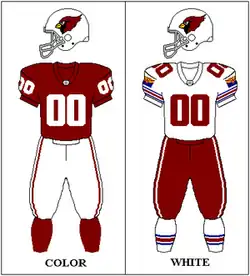 Before the 2023 season, the Cardinals unveiled new uniforms.[74] Most notably, the team opted to wear all-red uniforms at home and all-white uniforms on the road, with all-black uniforms as the alternate. The red uniform featured the state name in front in addition to white numbers with silver trim. The white uniform featured red numbers with black trim, and red and silver stripes along the pants and sleeves. The black alternate uniform design mirrored that of the white uniform, featuring red numbers with silver trim, and red and silver stripes along the pants and sleeves. On both uniforms, the silver sleeve stripe contained the team name. Both the red and white uniforms are worn with white helmets and silver facemasks, while the black uniform is worn with the black helmets from 2022. The new helmets featured silver flakes while the black helmet had red flakes in them.[2][3][75]