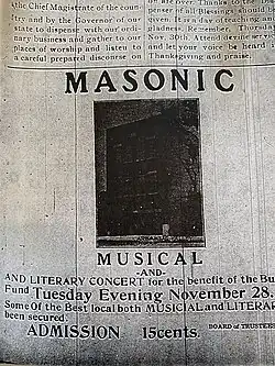 Constructed to be a local Prince Hall Freemasons Lodge in 1910, it was listed on the National Register of Historic Places in 1977.[1] It has also been known as Black Masonic Lodge.