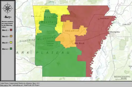 Table of United States congressional district boundary maps in the State of Arkansas, presented chronologically.[3] All redistricting events that took place in Arkansas between 1973 and 2013 are shown.