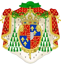A coat of arms with cartel: in 1 and 4: Gules with golden chains laid in an orle, cross and saltire, loaded in the heart of a natural emerald (which is from Navarre); in 2 and 3: azure with three fleurs de lys d'or (which is from France); on the whole, gone: in 1: Gules with nine twins of gold, placed 3, 3, 3 (which is Rohan); and in 2: of ermine (which is from Brittany).