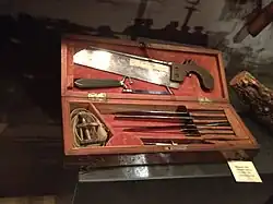 The Medical Department was responsible for acquiring and distributing medicine, medical equipment, hospital food and similar supplies.[38] The Ordnance Department was responsible for the development, procurement, storage, distribution and repair of all ordnance and ordnance-related equipment such as limbers and caissons and accoutrements.[39] The Subsistence Department was in charge of the purchase, storage and distribution of food rations and related items.[40] And the Quartermaster Department was responsible for all other supplies not covered by another department like clothing, tents, horses and fodder. It was also responsible for any non-Ordnance vehicles (i.e. wagons, ambulances, traveling forges); constructing and maintaining Army buildings; and providing transportation services for the entire Army, including the other supply departments.[41]