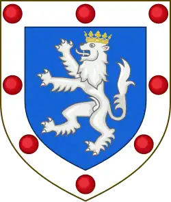 Escutcheon: Azure, a lion rampant argent ducally crowned or a bordure of the second charged with eight torteaux. |