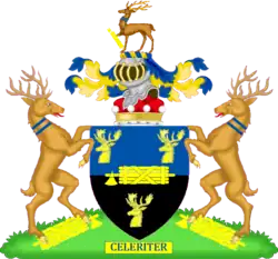 Escutcheon: Per fess Azure and Sable a fasces fesswise between three stags’ heads couped Or. |