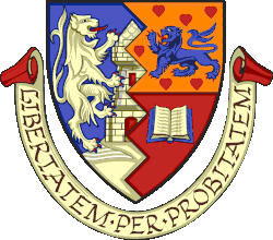 Escutcheon: Tierced in pairle reversed; 1st, per pale dexter bendy of six Or and Azure within a bordure Gules; sinister Argent, an antique crown in chief Gules and a martlet in base Azure, on a chief of the last three fleurs-de-lys Or; 2nd, Argent, a lion passant guardant Gules, imperially crowned Or; 3rd, Vert, an escallop Or; and over all upon a chief Or three open books Proper, binding and fore-edges Azure. | |