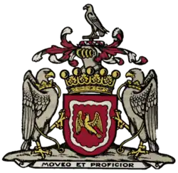 Crests: 1st, issuant out of the battlements of a castle argent charged with a cross-flory gules, a dexter cubit arm, vested sable, charged with a key as in the arms, cuff or, the hand proper holding a cross patee fitchee in bend also argent; 2nd, over an armed arm brandishing a falchion proper, a trident and spear in saltire or. Supporters: Dexter, an eagle proper; sinister, a lion gules; each gorged with a collar or, pendant therefrom a bezant charged with a rose gules. Motto: Fortes fortuna juvat (Fortune favours the brave)[45][46] |