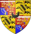 Coronet: That of a son of a sovereign Crest: On a coronet composed of crosses-patée, and fleur-de-lis, a lion statant guardant or, crowned with the like coronet, and differenced with a label of three points argent, charged as in the arms. Supporters: The royal supporters, differenced with the like coronet and label.[15][1] |