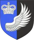 Escutcheon: Per pale Azure and Sable a wing and in the canton the Royal Crown Argent.