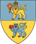 Escutcheon: Per fess Bleu Céleste and Or in chief a lion passant guardant Or royally crowned proper holding in its dexter paw a maple leaf Gules fimbriated Or in base a lion passant guardant Bleu Céleste holding in its dexter paw a heart Gules.