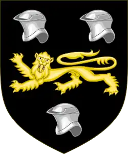 Arms: Sable a Lion passant guardant Or between three Esquires' Helmets Argent; |