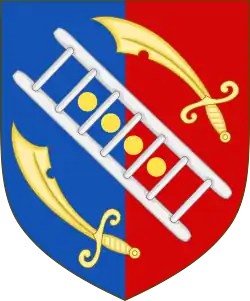 Escutcheon: Per pale Azure and Gules four roundels in bend Or between the rungs of a ladder bendwise throughout Argent all between two seaxes bendwise points upwards and cutting edges outwards Or. |